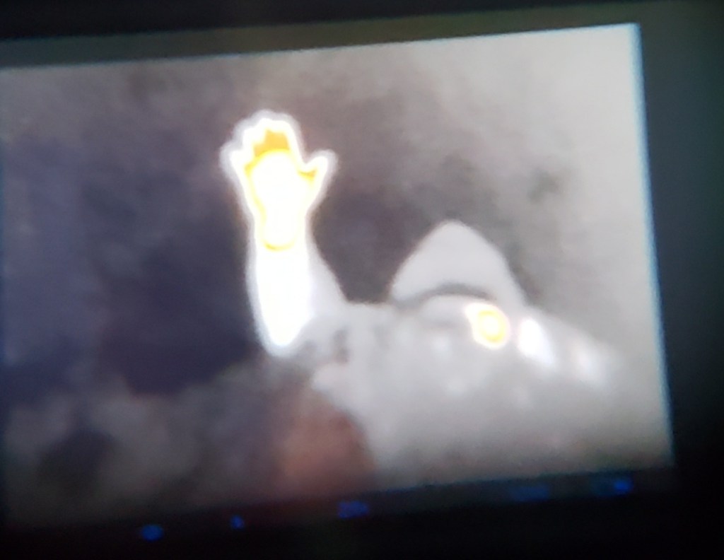 So obviously I was pretty irritated. My friend had a piece of 4 x 6 cotton cloth with him. He wanted to try that against the thermal optic. We strung it up behind 2 bushes and he stood about 1.5 ft off the fabric. What do you know it blocked his thermal signature….. see below. I had him hold his hand up to show the heat difference.