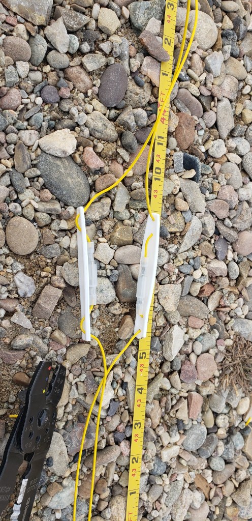 I decided to try to make a linked dipole. I wanted to cut it for JS8CALL on all 4 bands. I had started with G10 Material for my insulators but I didn’t make them long enough so I ended up using plastic silverware handles for the insulators between where I separated the band.