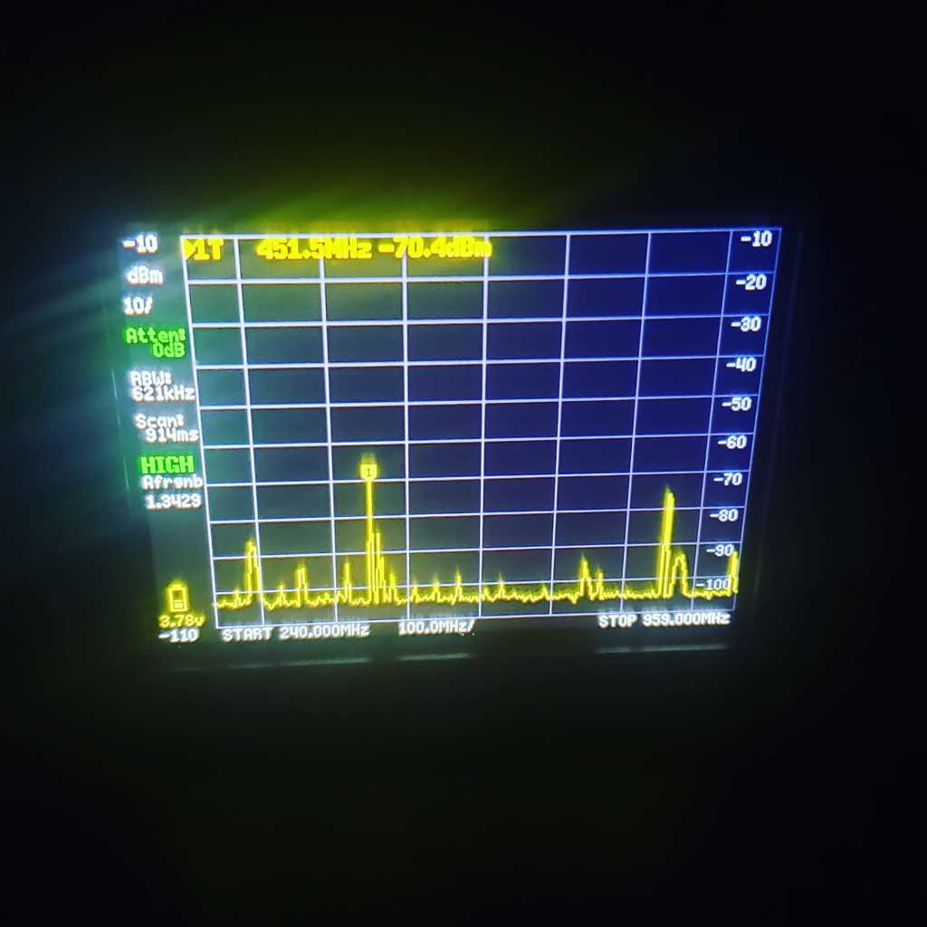 This was the first time I was able to really test the tinySA. We did some distance testing and with one person on 1 watt of power on a handheld. The tinySA picked up his frequency at 350 yds.