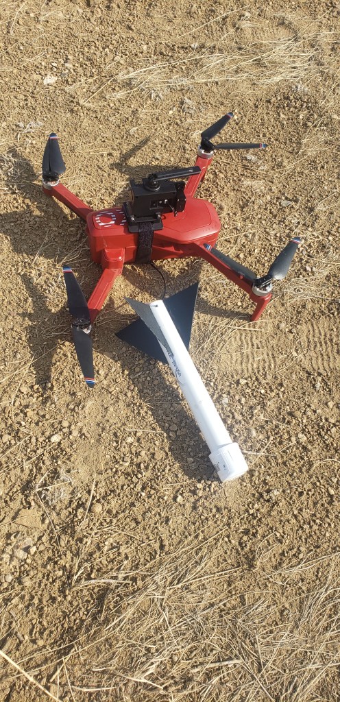 The drone took off easily from sitting on the ground with the projectile connected to it. The drone flew flew fairly easily with the payload. As for the aiming using the camera, that was a failure. My camera doesn’t seem to want to look directly down which made it impossible to see what it was hovering over. Also the payload really effects the battery life. I don’t think with this particular drone I could fly out 500 yards, drop the payload, and then return home. I would probably need a larger drone for that. As for using the dropping device to string up an HF antenna in the trees this particular setup would work great!