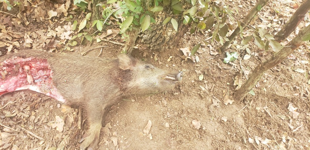I fixed that cable snare and set up 2 the next night. When I came back the next morning the first snare had been tripped and judging by the kink in the cable I must have had a pig in it for a moment. I went to the 2nd snare and to my amazement there was a dead pig in it! Unfortunately the Coyotes had already gotten to it and ate most of it. So we took the pig out of the snare and took it back to the house to take care of it.